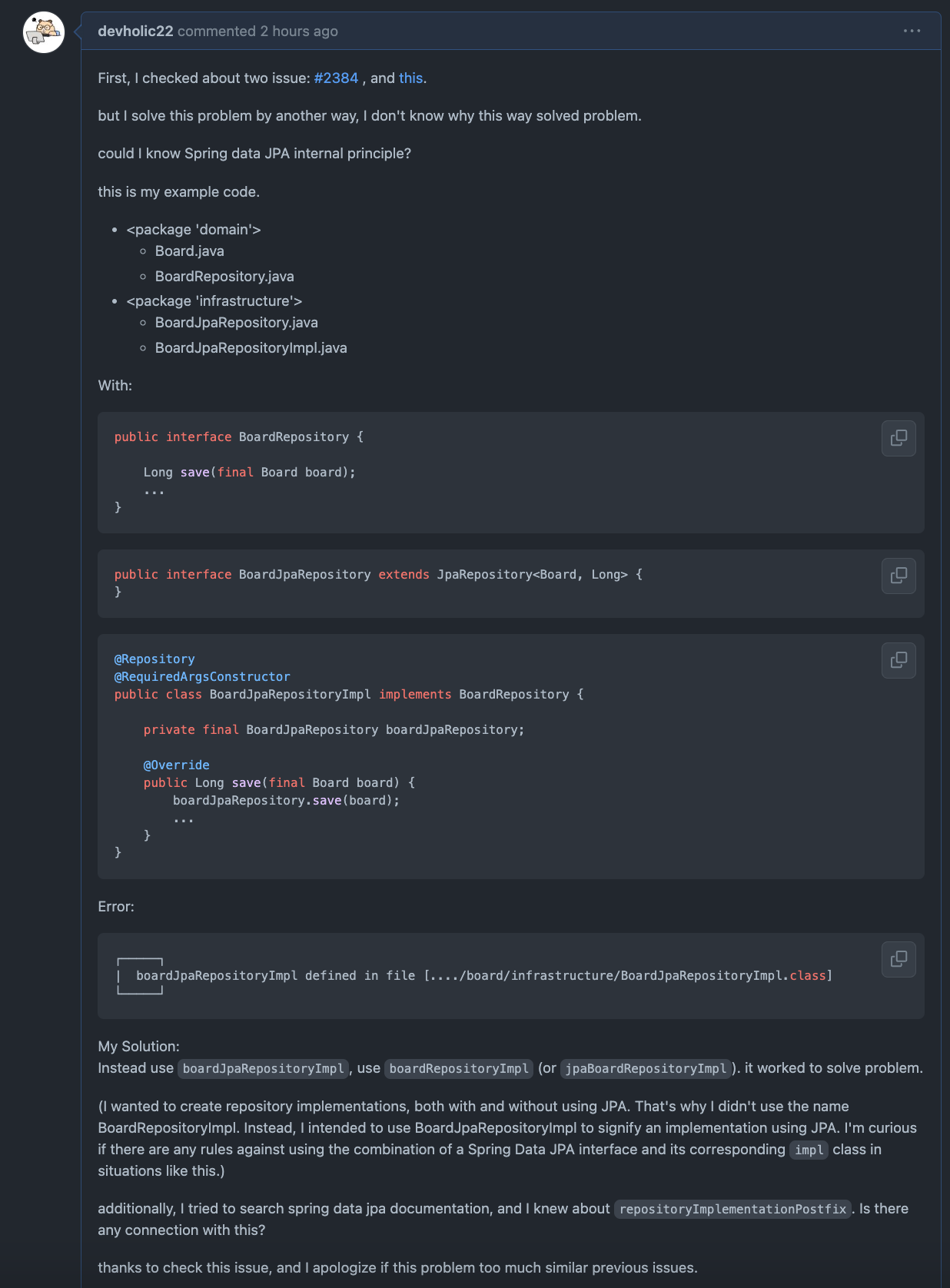 ๊ทธ๋ฐ๋ฐ ๊ทธ๋ ๊ฒ ๋ ๊ตฌํ์ฒด์ ์ด๋ฆ์ด BoardJpaRepositoryImpl์ธ๋ฐ, ์ด ํด๋์ค๋ BoardJpaRepository๋ฅผ ์ฐธ์กฐํ๊ณ ์์ต๋๋ค. ๋ฐ๋ผ์, ๊ตฌํ์ฒด๊ฐ ์์ ์ ์ธํฐํ์ด์ค๋ฅผ ์ฐธ์กฐํ๊ฒ ๋ ๊ผด์