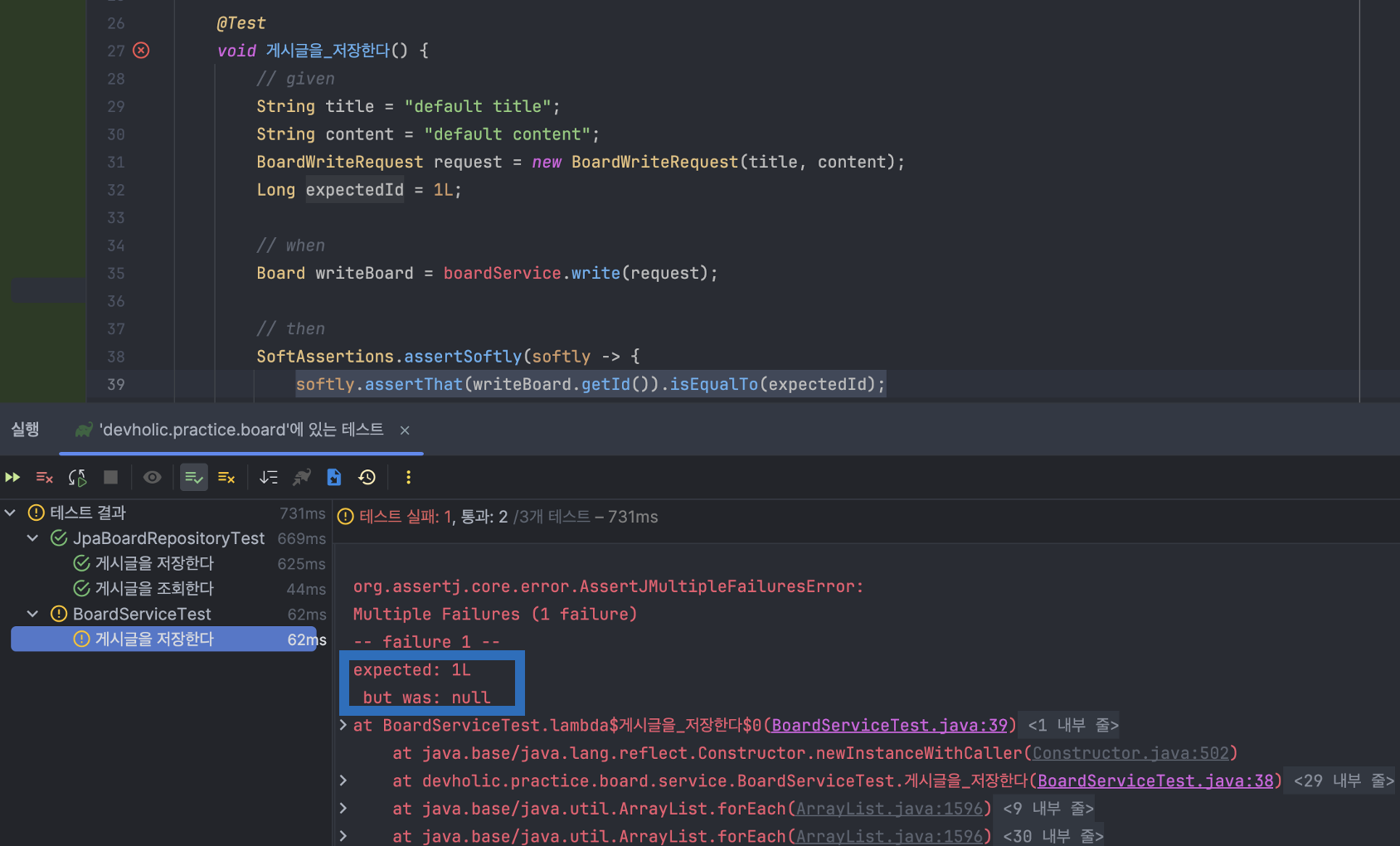 ๋ฆฌํฌ์งํ ๋ฆฌ์์ ๋ฐํํ Board๋ ์์ํ๋ ๊ฒ์๊ธ์ด๊ธฐ ๋๋ฌธ์, ๊ธฐ์กด writeBoard์์ id๊ฐ ์์ฑ๋์ด ์์ง ์๋๋ผ๋ saveBoard์ id ๊ฐ์ด expectedId์ ๊ฐ์์ ๊ฒ์ฆํด ๋ณผ ์ ์์ต๋๋ค.