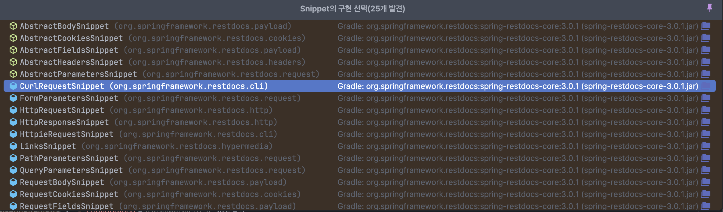 ๊ทธ ์ด์ ๋ org.springframework.restdocs.defaultSnippets์ 6๊ฐ์ snippetName์ด ์๊ธฐ ๋๋ฌธ์ ๋๋ค.