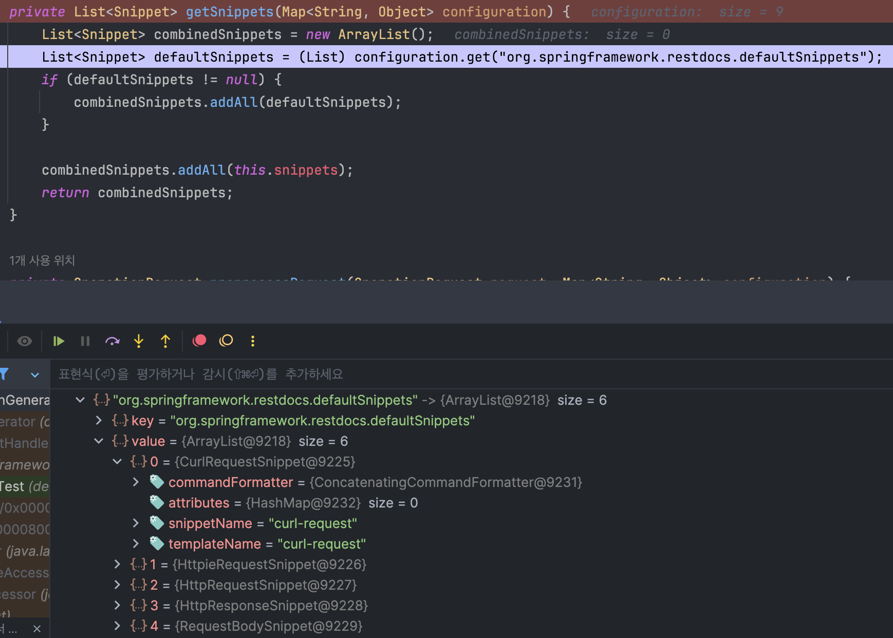 this.getSnippets๋ฅผ ๋ณด๋ฉด ์ adoc ํ์ผ๋ค์ด curl-request.adoc, http-request.adoc, http-response.adoc ๋ฑ ์ด 6๊ฐ๋ก ์์ฑ๋๋์ง๋ ์ ์ ์์ต๋๋ค.