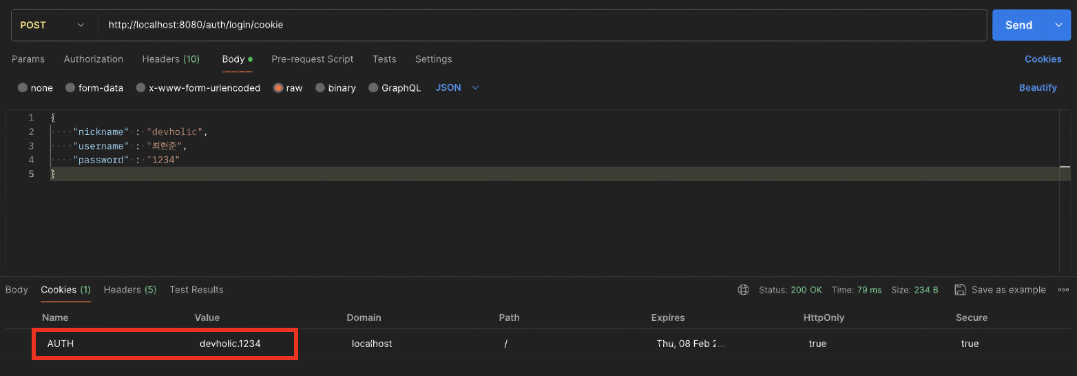 - ์ฟ ํค๋ ํค-๊ฐ ๊ตฌ์กฐ๋ก ์ด๋ฃจ์ด์ ธ ์์ต๋๋ค. ํค ์ด๋ฆ์ AUTH, ๊ฐ์ ํ์์ ๋๋ค์ + "." + ํ์์ ๋น๋ฐ๋ฒํธ๋ก ํ๊ฒ ์ต๋๋ค. (์๋๋ ๋น๋ฐ๋ฒํธ๋ ์ํธํ ์ฒ๋ฆฌ๋ฅผ ํด์ผ ํ์ง๋ง, ํด๋น ๊ธ์์์ ์ฃผ์ ๋ฅผ ๋ฒ์ด๋ ๊ฒ ๊ฐ์ ๋๊ธฐ๊ฒ ์ต๋๋ค.)