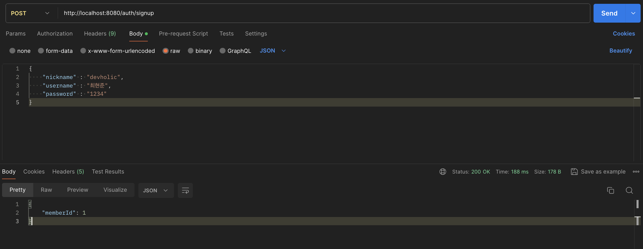 ํ์๊ฐ์ ์ ํฌ์คํธ๋งจ์ผ๋ก ์คํํด ๋ณด๋ฉด ์๋์ ๊ฐ์ด ์์ฑ๋ memberId๊ฐ ๋์ต๋๋ค. (๋๋ค์์ด ๋ฑ๋ก๋์ง ์์๋ ๊ฒ์ผ ๊ฒฝ์ฐ)