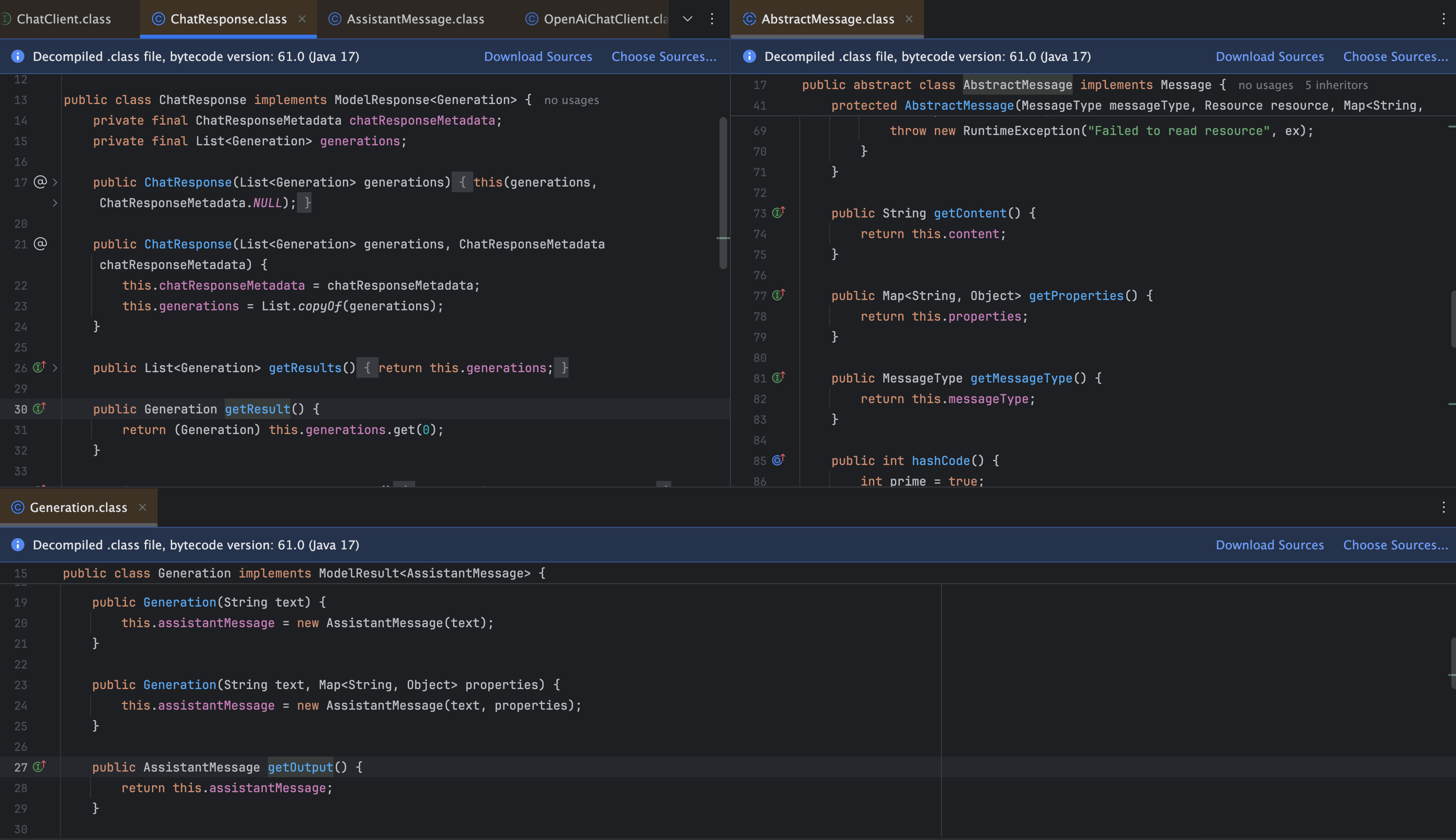 - Generation์ getOutput ๋ฉ์๋๋ฅผ ํตํด, Generation์ด ๊ฐ์ง๊ณ ์๋ AssistantMessage๋ฅผ ๋ฐ์ต๋๋ค.