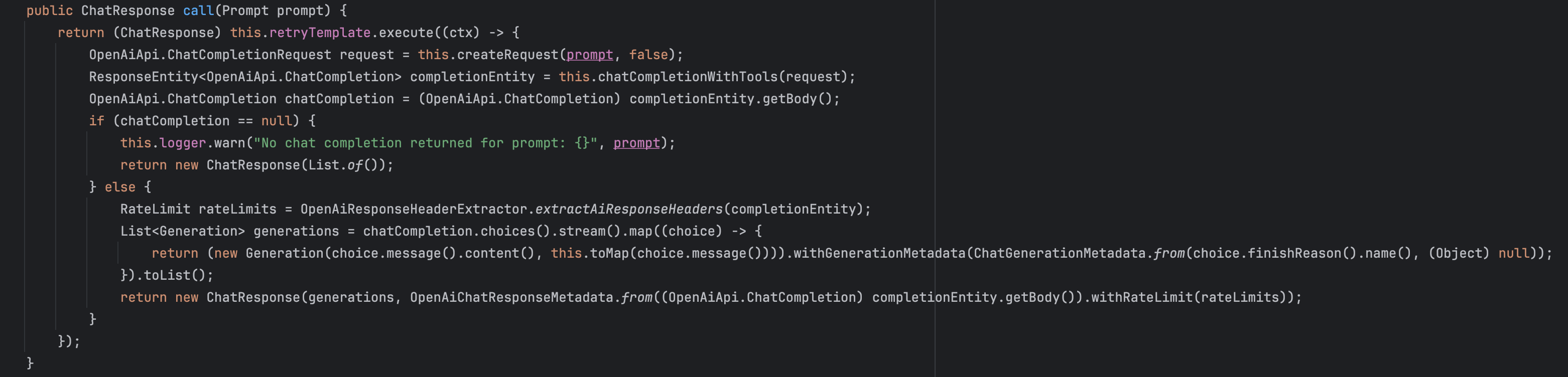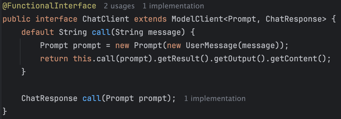 ์ฌ๋ด์ผ๋ก, ChatClient์ ๊ตฌํ์ฒด์ธ OpenAiChatClient์ ์ฝ๋๋ฅผ ๋ณด๋ฉด call์ ์ด๋ป๊ฒ ์ค๋ฒ๋ผ์ด๋ฉํ๋์ง ๋ณด์ค ์ ์์ต๋๋ค.
