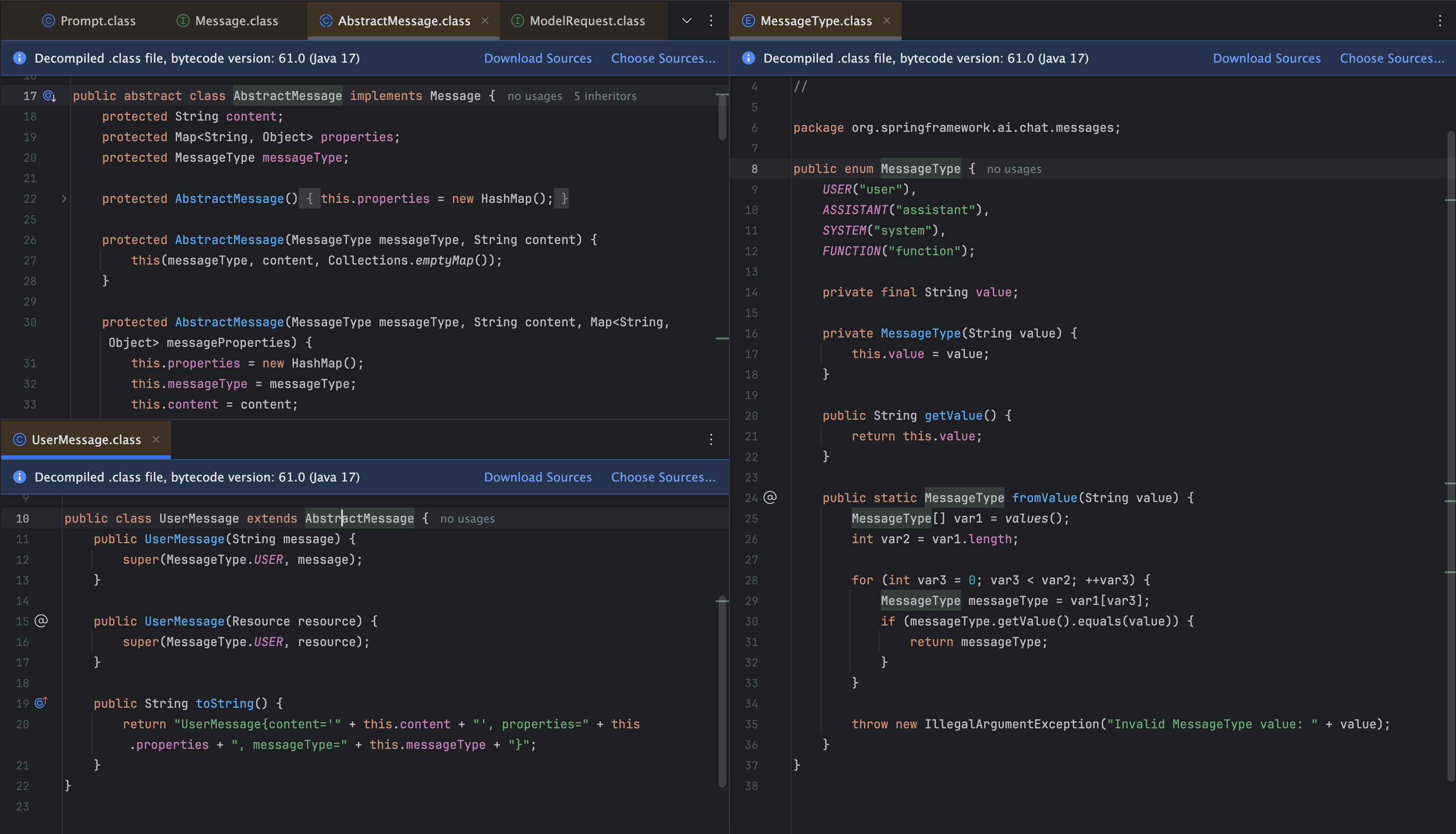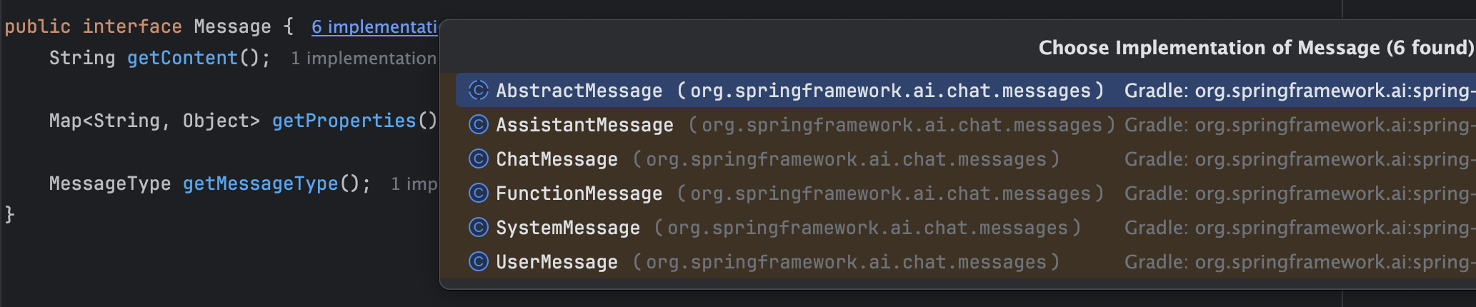 ์ผ๋ก UserMessage, AssistantMessage๊ฐ ํจ๊ป ์๋ ๊ฒ์ ๊ธฐ์ตํ๊ณ ๊ณ์ค ๊ฒ๋๋ค. ๊ทธ๋ฆฌ๊ณ ํจ๊ป ๋์๋ MessageType์ ํตํด, ๋ฉ์์ง์ ํ์