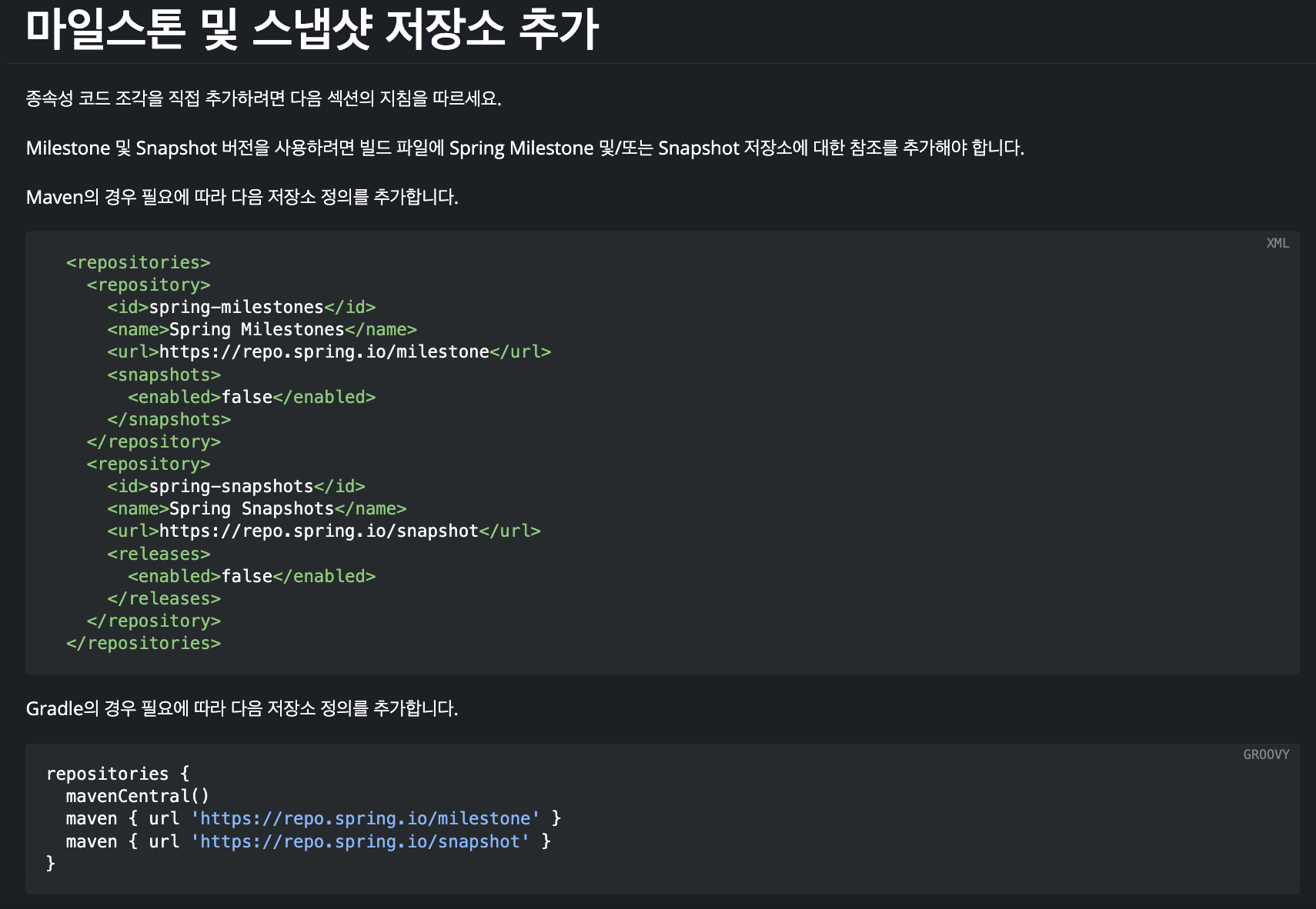 ๋จผ์ , build.gradle ์์ ์๋ repositories๋ฅผ ์๋ ์ฌ์ง๊ณผ ๊ฐ์ด ์์ฑํด์ผ ํฉ๋๋ค. Spring AI๋ ์์ง ๊ณ์ ๊ฐ๋ฐ ์ค์ด๋ผ ๋ง์ผ์คํค๊ณผ ์ค๋ ์ท์ ๊ด๋ฆฌ๋์ด ์์ด ๊ทธ๋ฐ ๊ฒ ๊ฐ์ต๋๋ค. (์คํ๋ง ๋ถํธ ์ฌ์ดํธ์์ OpenAI ๋ํ๋์๋ฅผ ํ์ธํ์ค ์๋ ์์ต๋๋ค.)