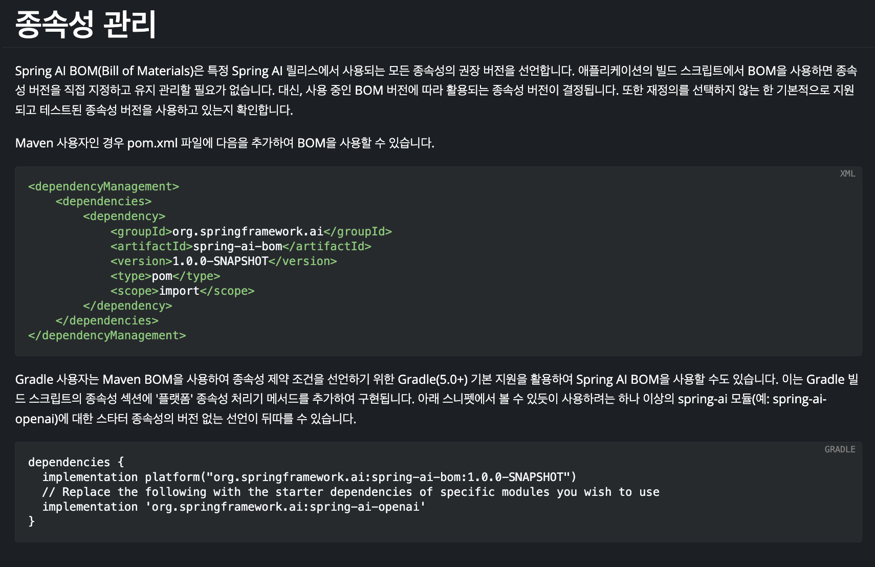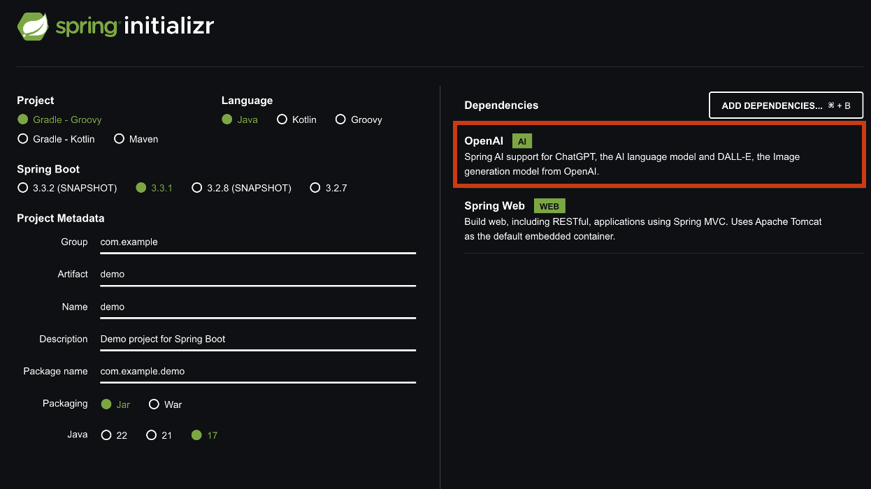 ๊ทธ๋ค์์ผ๋ก๋ dependencies์ (OpenAI๋ฅผ ์ด์ฉํ ๊ฒฝ์ฐ) org.springframework.ai:spring-ai-openai ๋ฑ์ ์์กด์ฑ์ ๋ฑ๋ก์์ผ์ผ ํฉ๋๋ค. ์ ๋ ๋ฒ์ ์ ๊ตฌ์ฒด์ ์ผ๋ก ๋ช