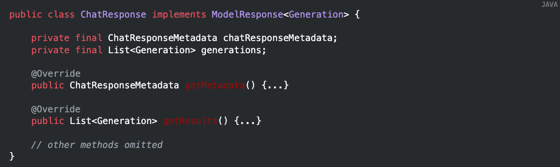 ChatResponse๋ ์ฑํ ์๋ต์ ๋ํ ๋ฉํ๋ฐ์ดํฐ (ChatResponseMetadata), Generation์ ๊ฐ์ง๋ ์๋ต ๊ฐ์ฒด์ ๋๋ค.