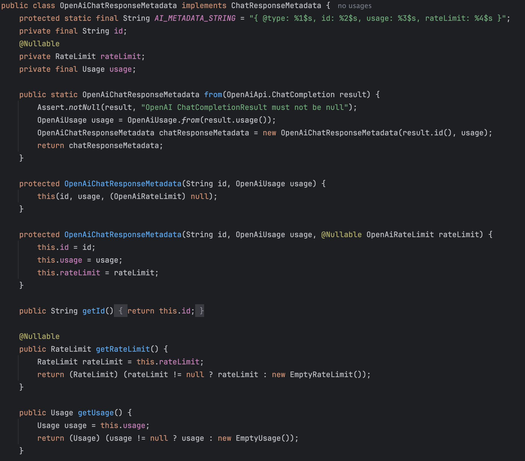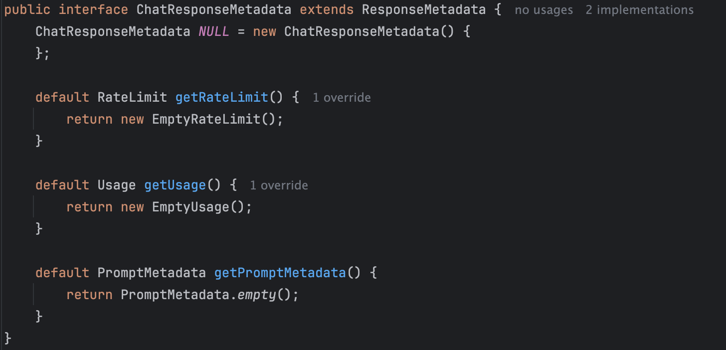์ด ์ธํฐํ์ด์ค๋ฅผ ๊ตฌํํ OpenAiChatResponseMetadata๋ฅผ ๋ณด๋ฉด ๋ ๊ตฌ์ฒด์ ์ผ๋ก ์๋ฆฌ๋ฅผ ์ดํดํ์ค ์ ์์ต๋๋ค.