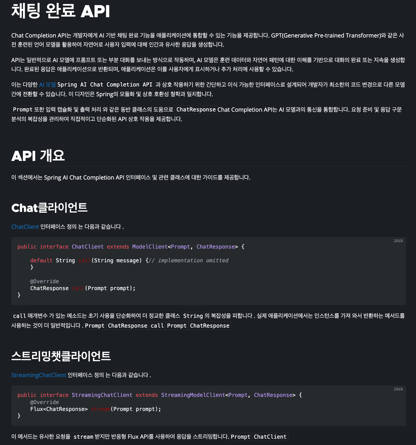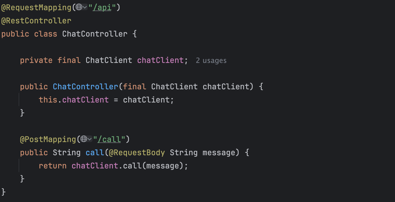 - Prompt ํ์ ์ผ๋ก ์์ฒญ์ ๋ณด๋ด๊ณ , ChatResponse ํ์ ์ผ๋ก ์๋ต์ ๋ฐ๊ณ ์ถ์ ๊ฒฝ์ฐ ์ฌ์ฉํ ์ ์์ต๋๋ค.