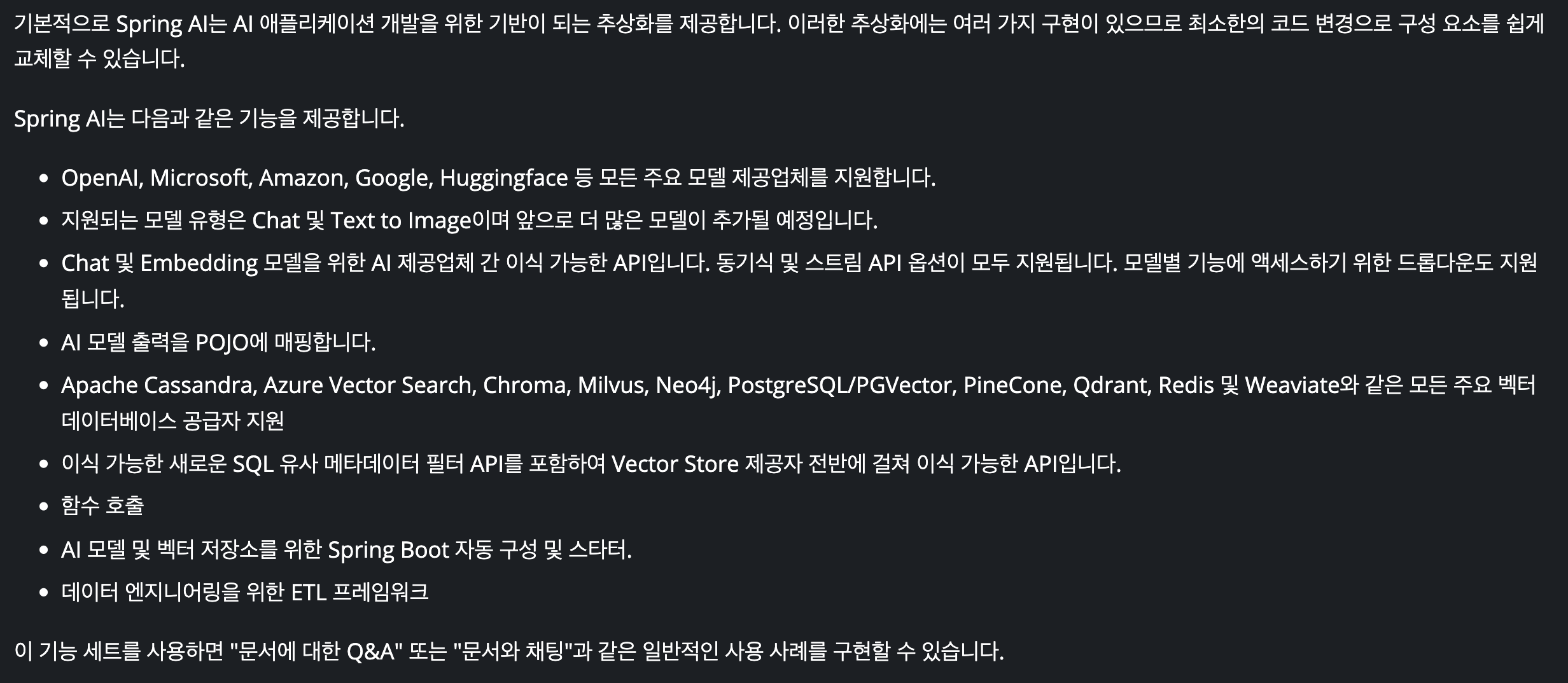 ๋ค์ ๊ธ์์๋ Spring AI๋ฅผ ๋ณด๋ฉฐ ๋๋ ์ฅ๋จ์ ์ ๋ํด ๊ธ์ ์์ฑํด ๋ณด๋๋ก ํ๊ฒ ์ต๋๋ค.