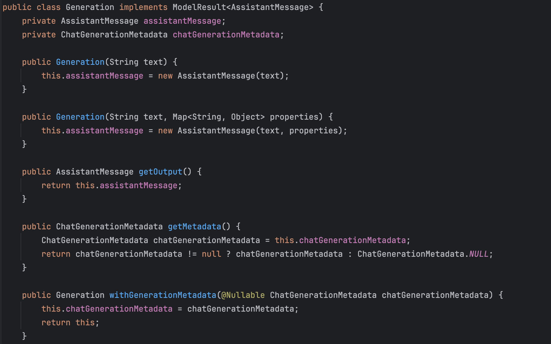 Generation ํด๋์ค๋ ๋ชจ๋ธ ๊ฒฐ๊ณผ๋ฅผ ํ์ฅํ์ฌ ๋ณด์กฐ ๋ฉ์์ง (AssistantMessage) ์๋ต๊ณผ ๊ด๋ จ๋ ๋ฉํ๋ฐ์ดํฐ๋ฅผ ๋ํ๋