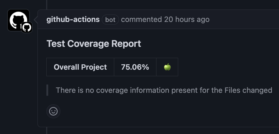 ์ดํ Pull Request๊ฐ ์คํ๋๋ฉด, ์๋์ ๊ฐ์ด ํ ์คํธ ์ปค๋ฒ๋ฆฌ์ง๋ฅผ ํ์ธํ ์ ์์ต๋๋ค.