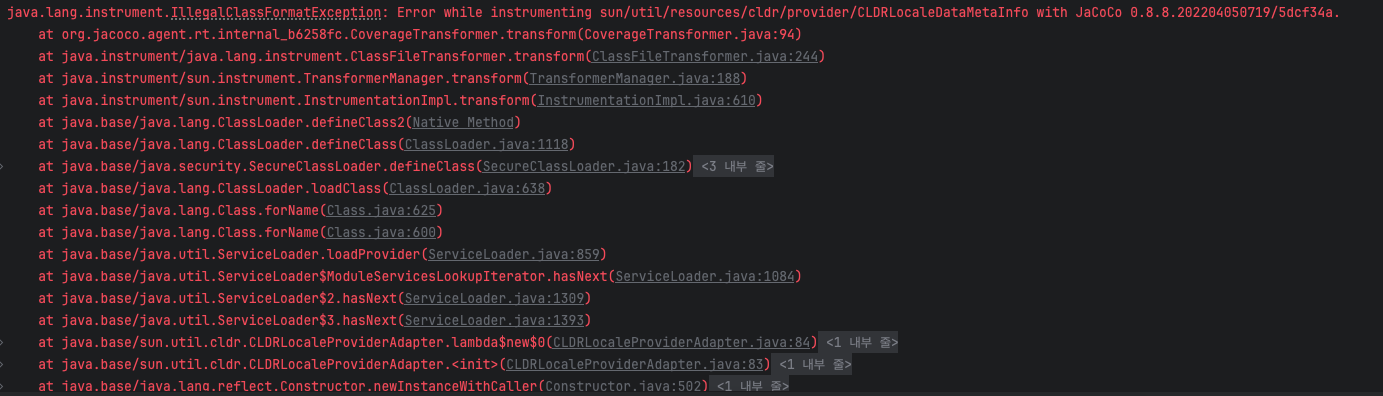 ๊ธฐ์กด์๋ ์ฌ๋ฌ ๋ธ๋ก๊ทธ ๊ธ๋ค์ ์ฐธ๊ณ ํ์ฌ, jacoco ๋ฒ์ ์ 0.8.8๋ก ์ค์ ํ์์ต๋๋ค. ๊ทธ ๊ฒฐ๊ณผ, ์๋์ฒ๋ผ ํ ์คํธ ์ค ์ค๋ฅ๊ฐ ๋ฐ์ํ์์์ ๋ณผ ์ ์์์ต๋๋ค.