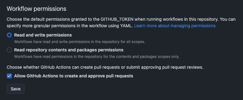 ๋ค์์ผ๋ก๋ ๊นํ๋ธ ๋ฆฌํฌ์งํฐ๋ฆฌ์์ Settings > Actions > General > Workflow permissions์ ๋ค์ด๊ฐ Read and write permissions๋ฅผ ์ฒดํฌํด์ค์ผ ํฉ๋๋ค.