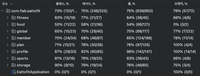 ์ค์ ๋ก์ปฌ์์ ํ ์คํธ ์ปค๋ฒ๋ฆฌ์ง๋ฅผ ํ์ธํด ๋ณด๋ฉด, ๋ชปํด๋ 75% ๊ทผ์ฒ๋ ๋์์ผ ํ์ต๋๋ค.