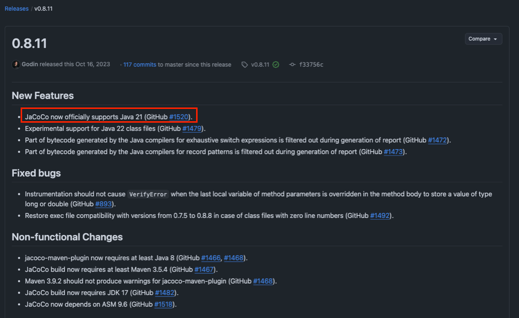 ์ค์ ๋ก jacoco์ ๊นํ๋ธ์ ์ง์ ๊ฐ์ ์ ํ๊ทธ๋ฅผ ๋ณด์๋ฉด, ๋ฒ์ ์ด ๊พธ์คํ ์ฌ๋ผ์ค๊ณ ๋ฒ์ ์ ๋ฐ๋ผ ์ง์๋๋ ์๋ฐ ๋ฒ์ ๋ํ ๋ค๋ฆ์ ๋ณผ ์ ์์ต๋๋ค.