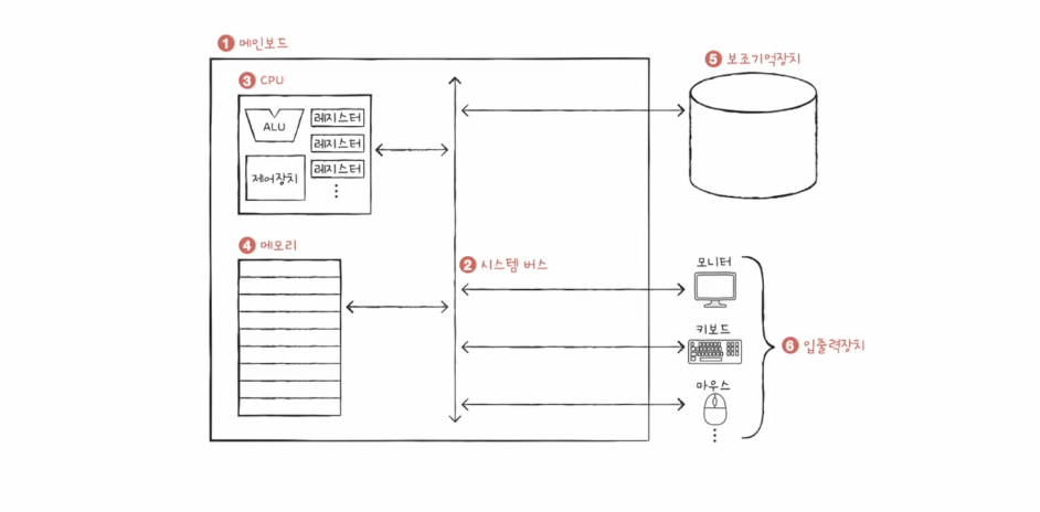 컴퓨터의 구조는 크게 CPU / 메모리 / 보조기억장치 / 입출력장치로 나눌 수 있습니다.