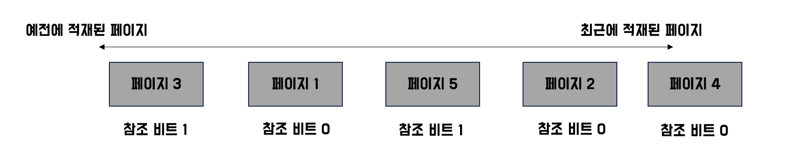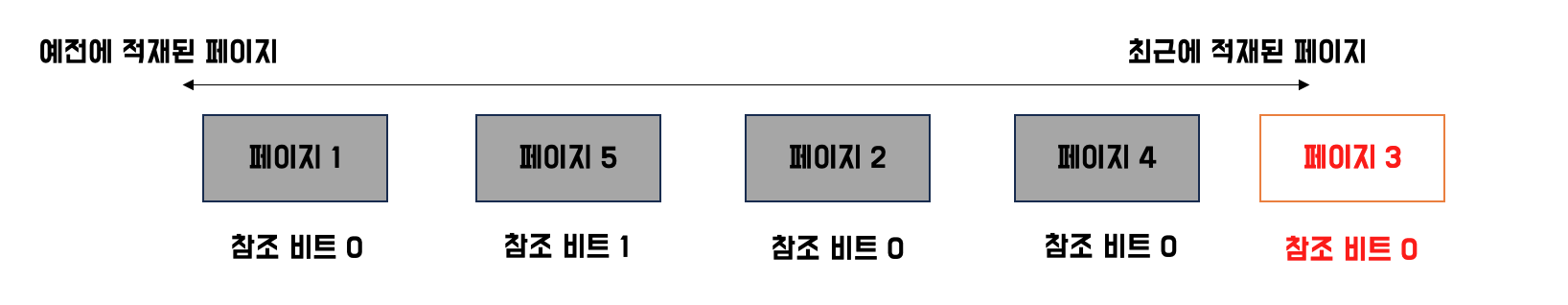 만약 CPU가 한 번 참조한 적이 있던 페이지라면 바로 내쫓지 않고, 적재된 시간을 현재 시간으로 설정하고 맨 끝으로 보내게 됩니다. 그런데 참조한 적이 없던 페이지라면 이 페이지를 내쫓게 됩니다.