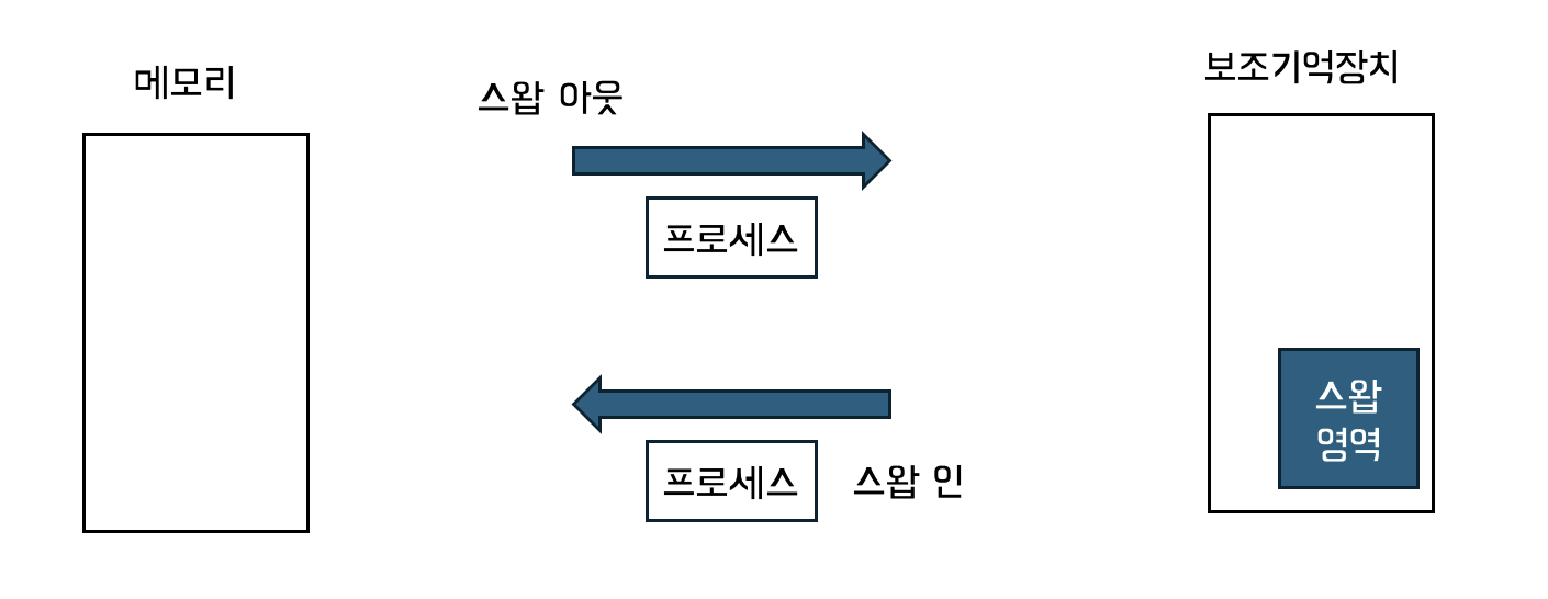 - 현재 사용되지 않는 프로세스들을 보조기억장치의 일부 영역 (스왑 영역)에 두고 (스왑 아웃), 그로 인해 생기게 된 빈 공간에 새로운 프로세스를 적재 (스왑 인)하는 과정입니다.