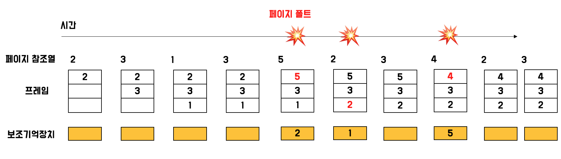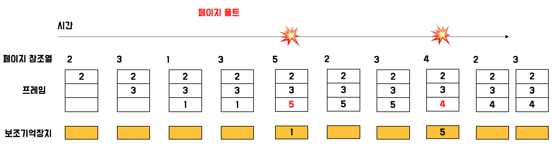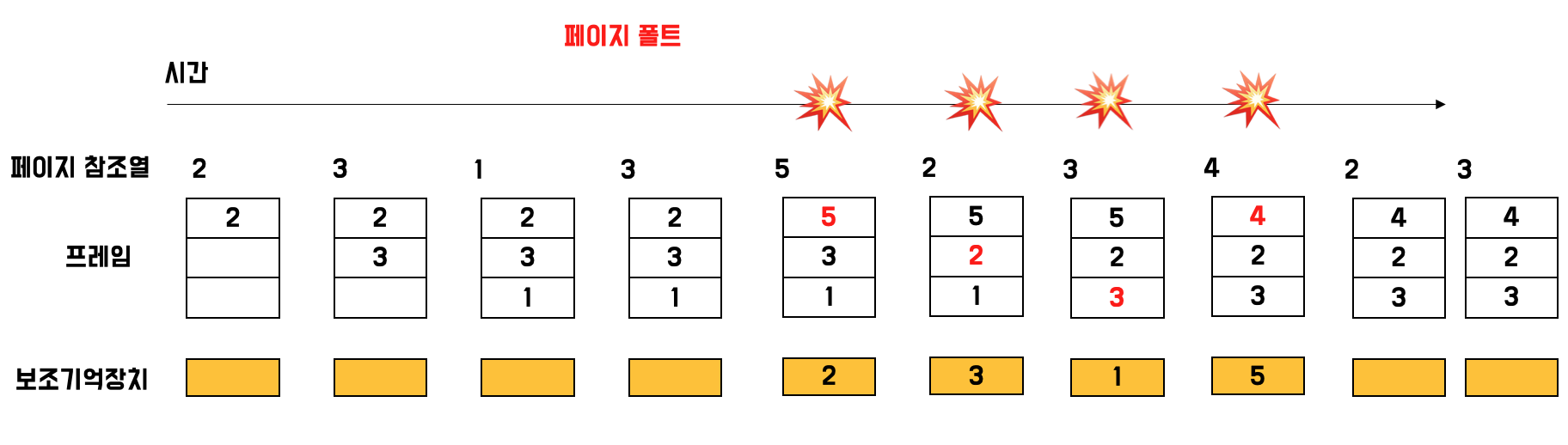 페이지 참조열이 아까와 같이 2 3 1 3 5 2 3 4 2 3으로 이루어져 있다고 가정하면, 위 사진과 같습니다.