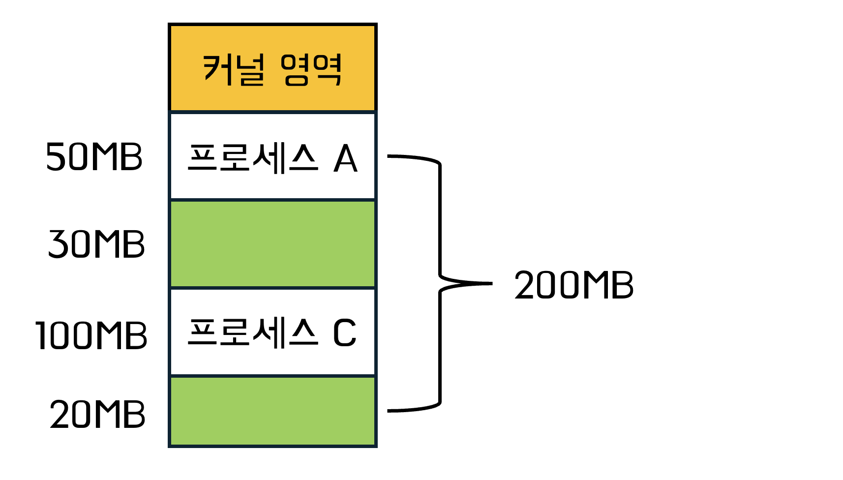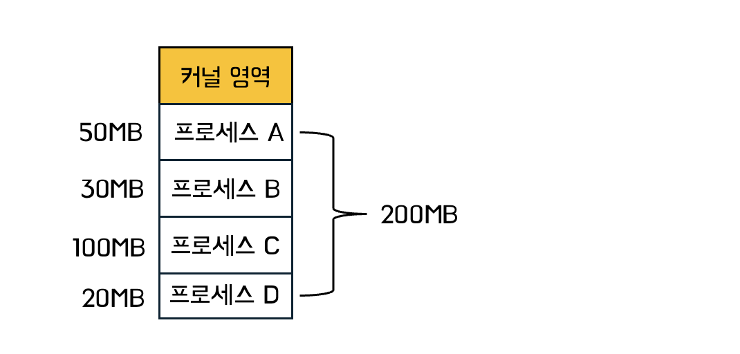 프로세스 A, B, C, D가 있고, 각각 50MB, 30MB, 100MB, 20MB를 차지한다고 가정합니다. (즉, 메모리는 200MB)