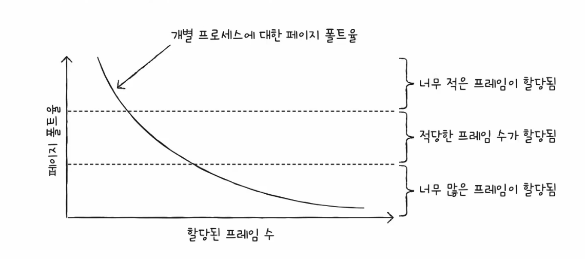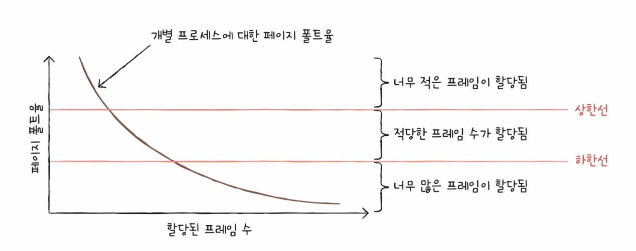 - 페이지 폴트율이 너무 높으면 그 프로세스는 너무 적은 프레임 수를 가지고 있다.