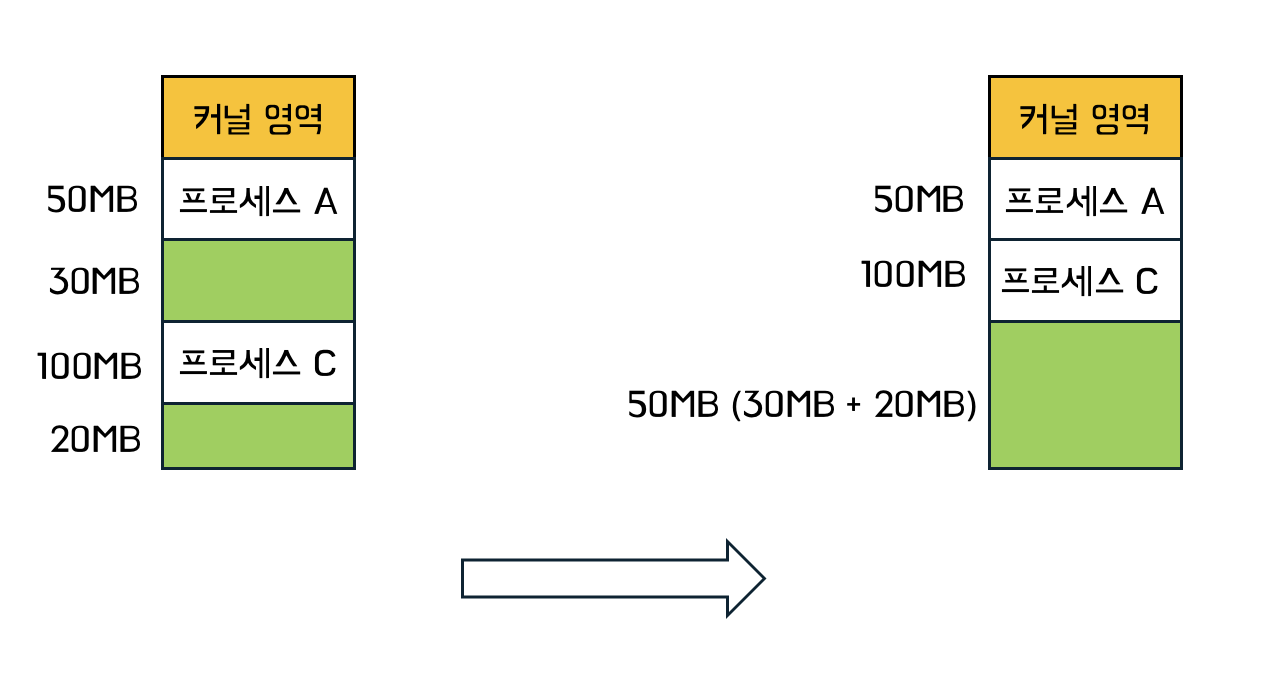 압축이란, 여기저기 흩어져 있는 빈 공간들을 하나로 모으는 방식입니다. 즉 위의 예시에서 있던 빈 공간을 한 공간으로 만들기 위해 프로세스들의 위치를 조정하는 것입니다.