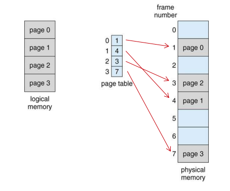 즉, <페이지 번호, 변위>로 이루어진 논리적 주소는 페이지 테이블을 통해 메모리의 <프레임 번호, 변위>로 변환됩니다.