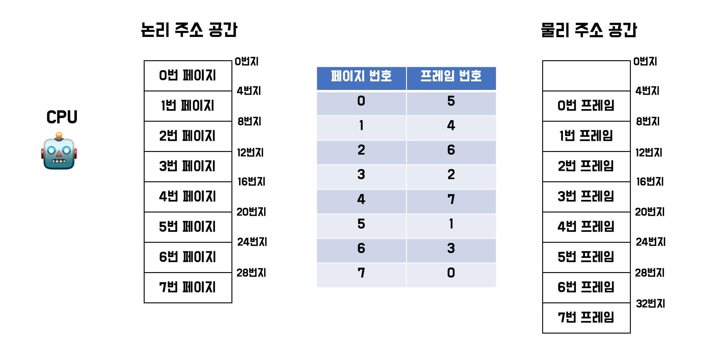 즉, <페이지 번호, 변위>로 이루어진 논리적 주소는 페이지 테이블을 통해 메모리의 <프레임 번호, 변위>로 변환됩니다.