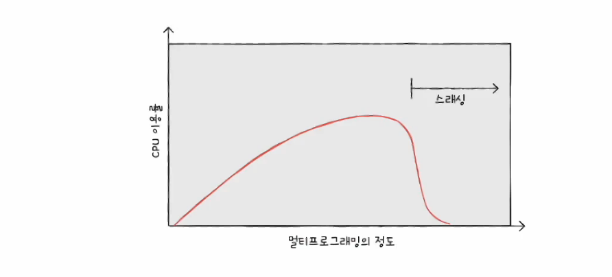 동시에 실행되고 있는 프로세스의 수가 많다고 해서 CPU의 이용률이 높다는 것은 아닙니다. 어느 정도까지는 CPU가 일을 계속함으로써 효율이 올라간다고 할 수 있지만, 더 높아질 경우 CPU 이용률이 스래싱으로 인해 떨어짐을 보이고 있습니다.