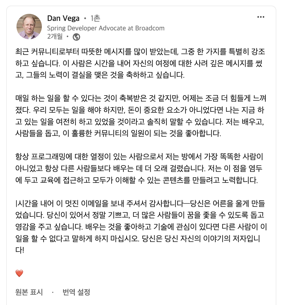 ๊ทธ๋ฆฌ๊ณ ์ด๋์ ๊ฒฝํ์ ์ ๊ฐ Spring AI์ ์ง์ ์ปจํธ๋ฆฌ๋ทฐํธ๋ฅผ ํด์ผ๊ฒ ๋ค๋ ์๊ฐ์ ๊ฐ๊ฒ ํด ์ฃผ์๊ณ , ์ฌํด ์ด 6๋ฒ์ ์ปจํธ๋ฆฌ๋ทฐํธ๋ฅผ ํ ์ ์์์ต๋๋ค. ๊ฐ์ฌํ๊ฒ๋ Spring AI ๋ฆด๋ฆฌ์ฆ ๋ ธํธ๊ฐ ๋์ฌ ๋ ์ ์ด๋ฆ๋ ํจ๊ป ์ฌ๋ผ๊ฐ ์ ๋ ์์์ต๋๋ค.
